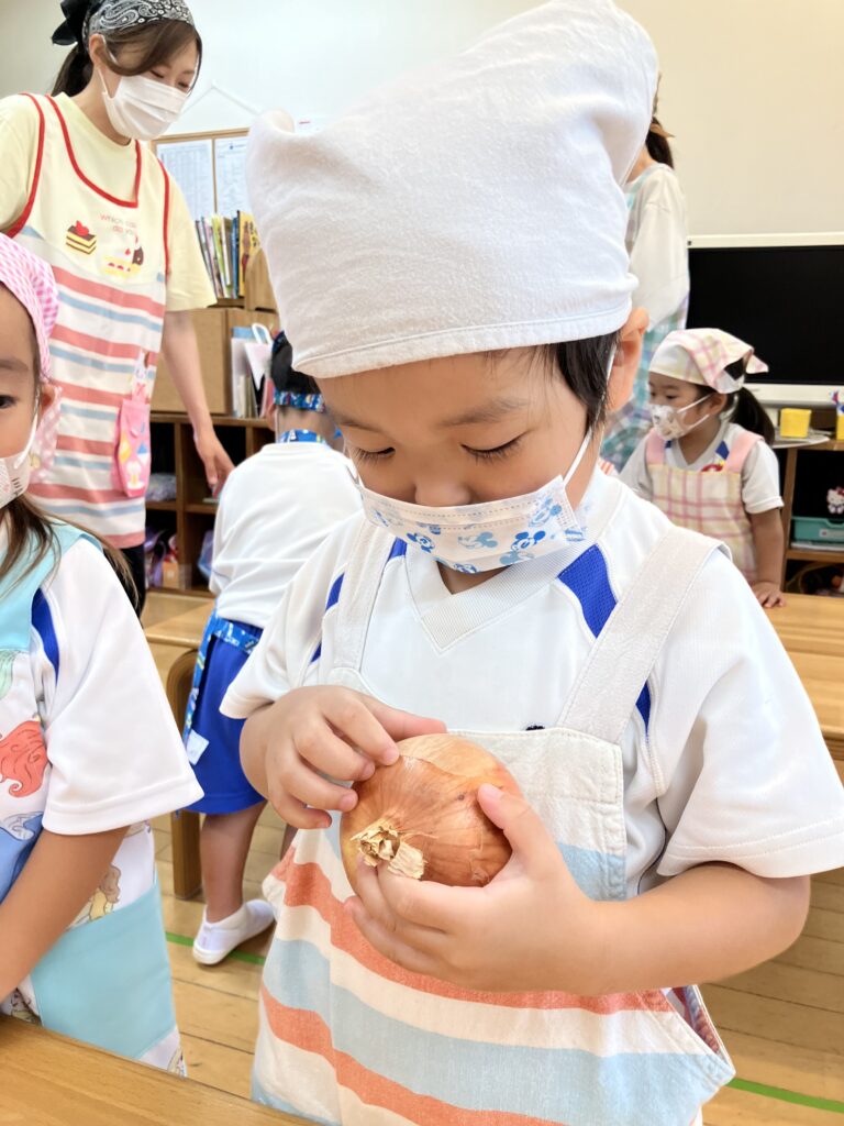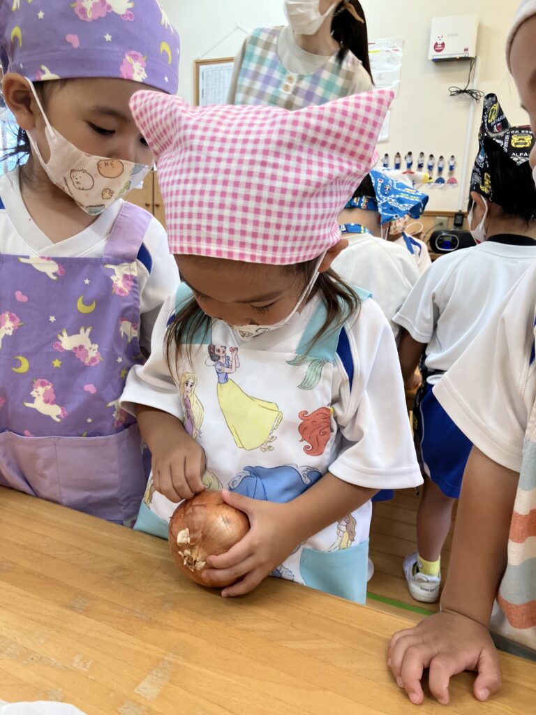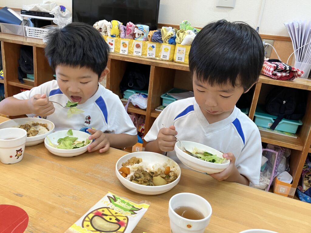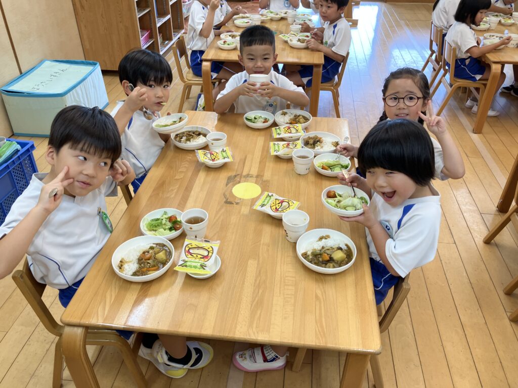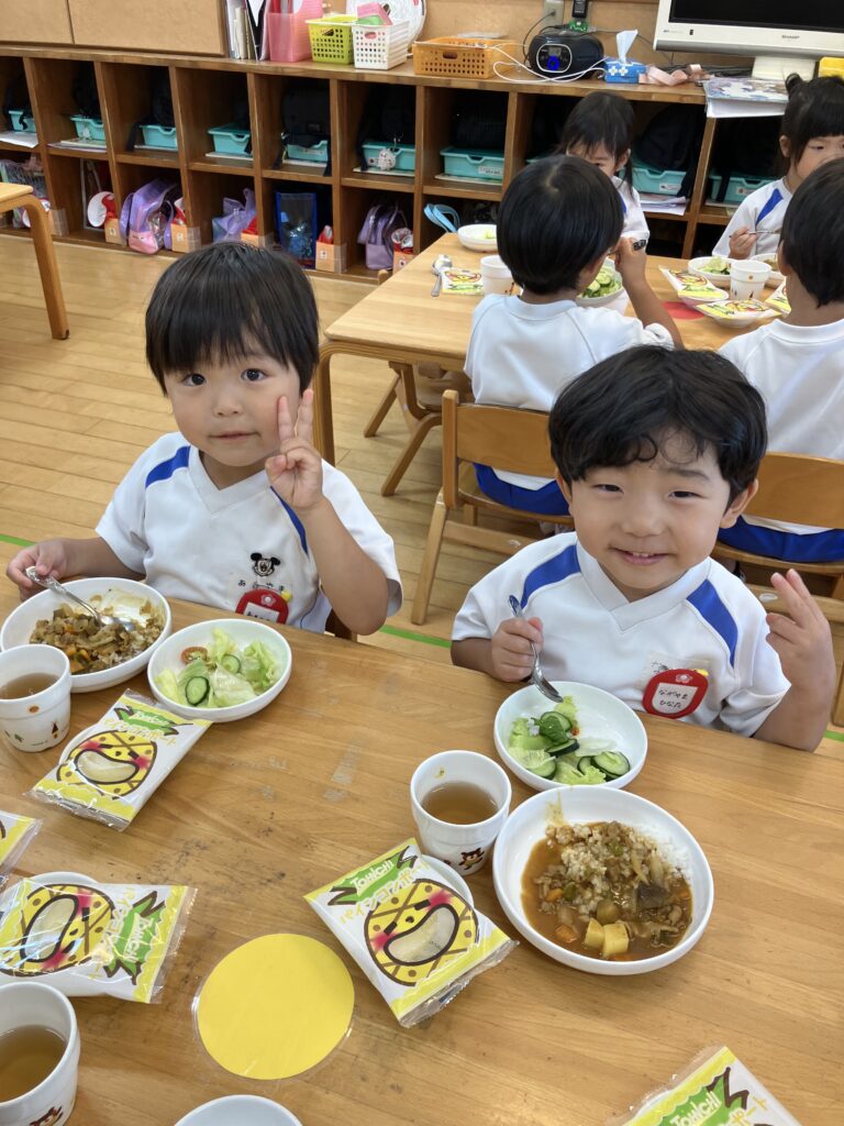 いい香りがしてくると「いいにおい!」「カレーの匂いがしてきた!」「お腹すいた!」と早くカレーを食べるのを楽しみにしていた子ども達です(^^)