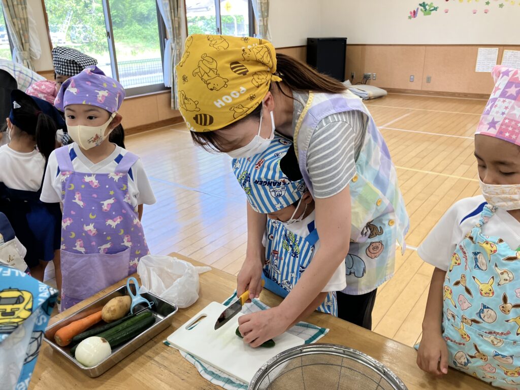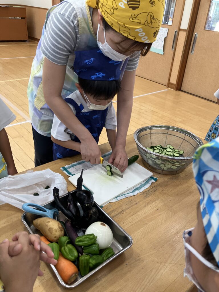 くま組・ぞう組・きりん組が畑で育てた夏野菜を使ってカレー作りをしました。